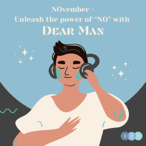When your wise mind is telling you to say “no”, DEAR MAN can be an effective way to do so while tending to relationships. You could use it to set limits around after-hour work emails, say no to a second date you aren’t feeling, or decline cat-sitting for your sister for the 8th time this year. Let’s remember that knowing when and how to say “no” is just as important as knowing when and how to say “yes.” Saying “no” can feel awkward and uncomfortable; however, with practice and the help of DEAR MAN, you can respect your limits while maintaining respect for yourself and others!